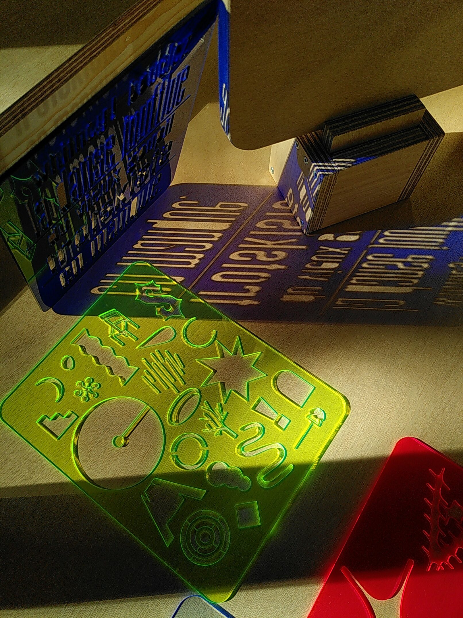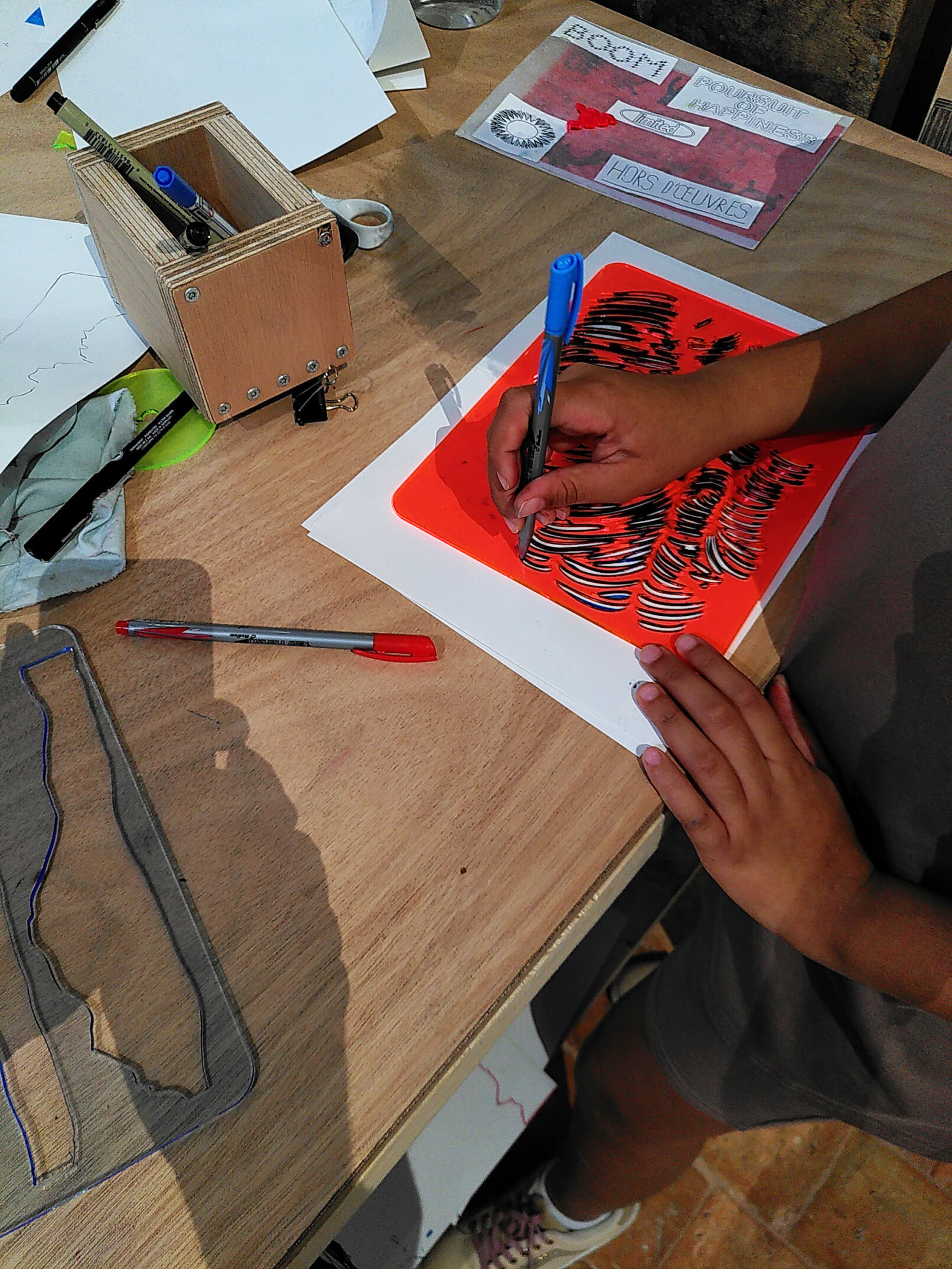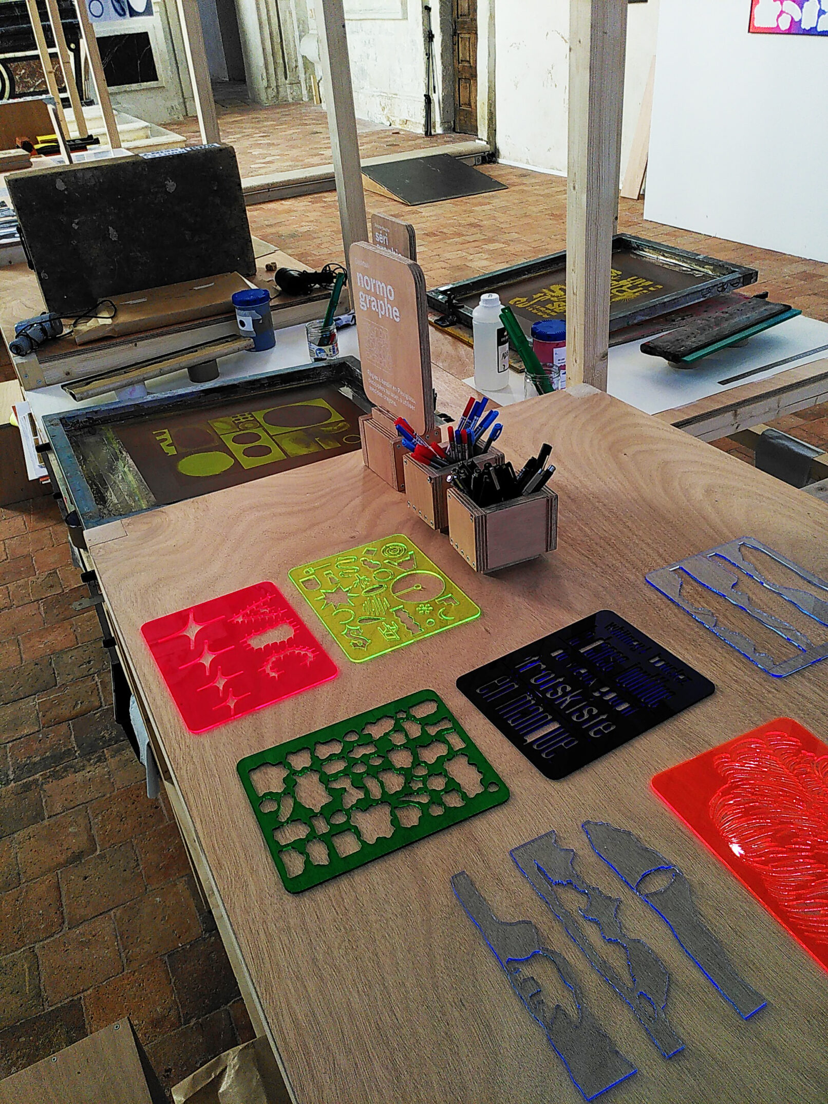 Le premier mets se compose de normographes (ou trace-lettre). Les cinq artistes de l’Atelier du Bourg ont composé chacun un normographe permettant aux participants de réaliser une œuvre en reprenant tout ou partie des motifs, en mono ou polychromie.