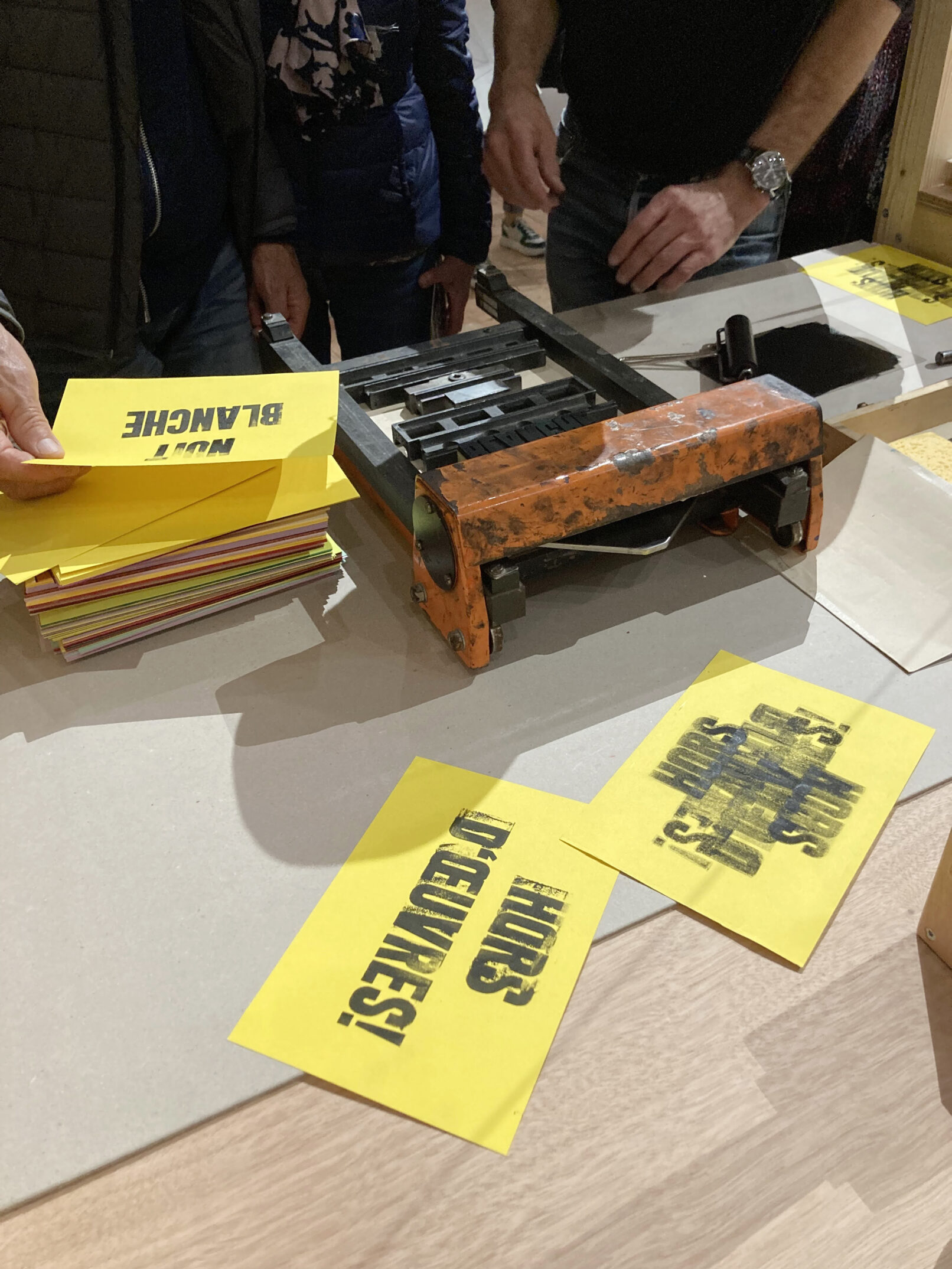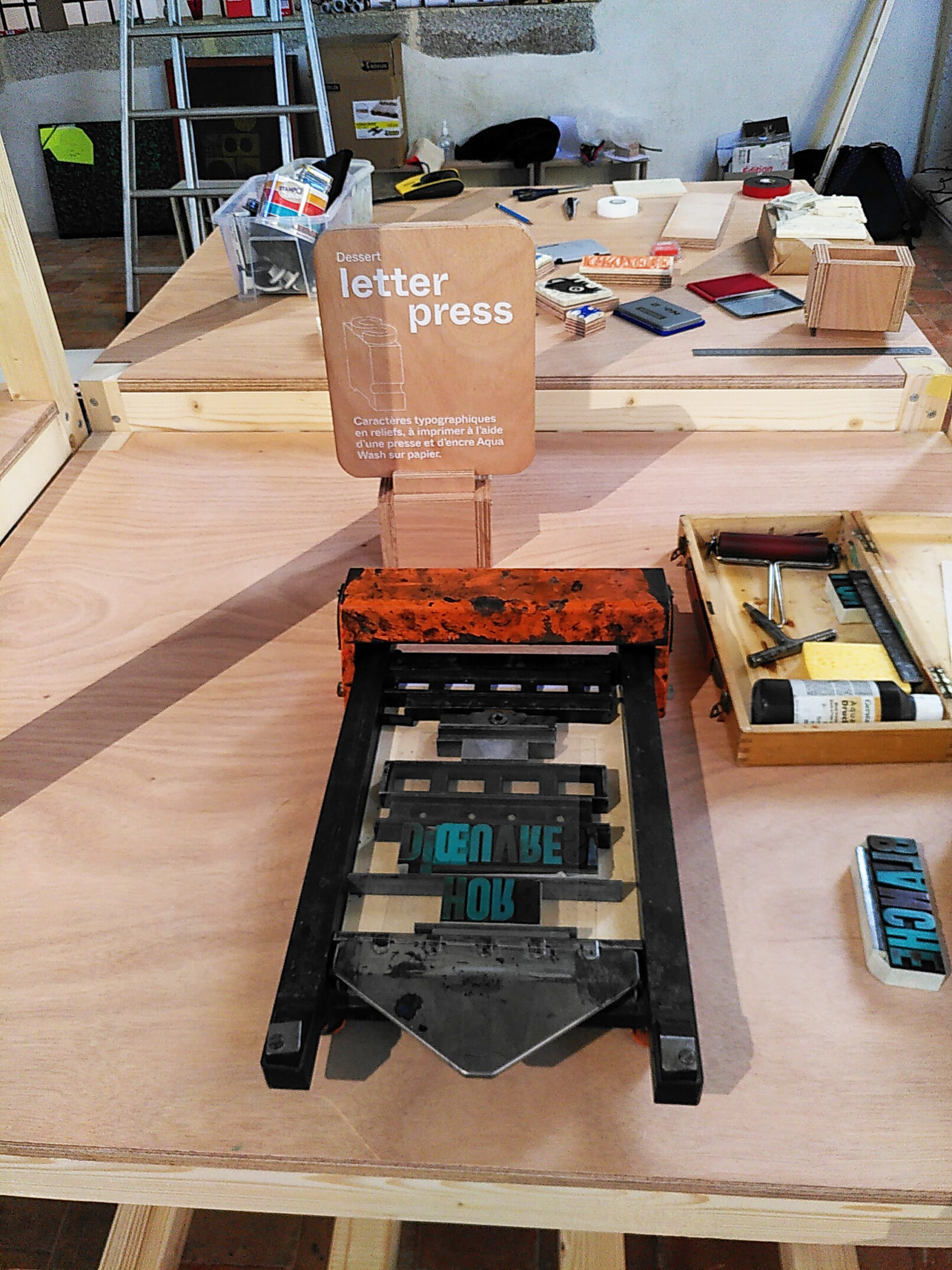 Avant le dessert, un atelier typo léger et digeste sur une petite presse d’épreuve. Les participants ont la possibilité d’imprimer « à l’ancienne » deux formes typographiques composées en lettres en bois ou en plomb. Ils auront la responsabilité de l’encrage et du tirage pour se servir eux-même.