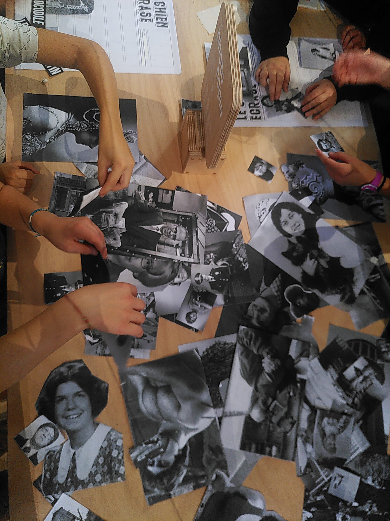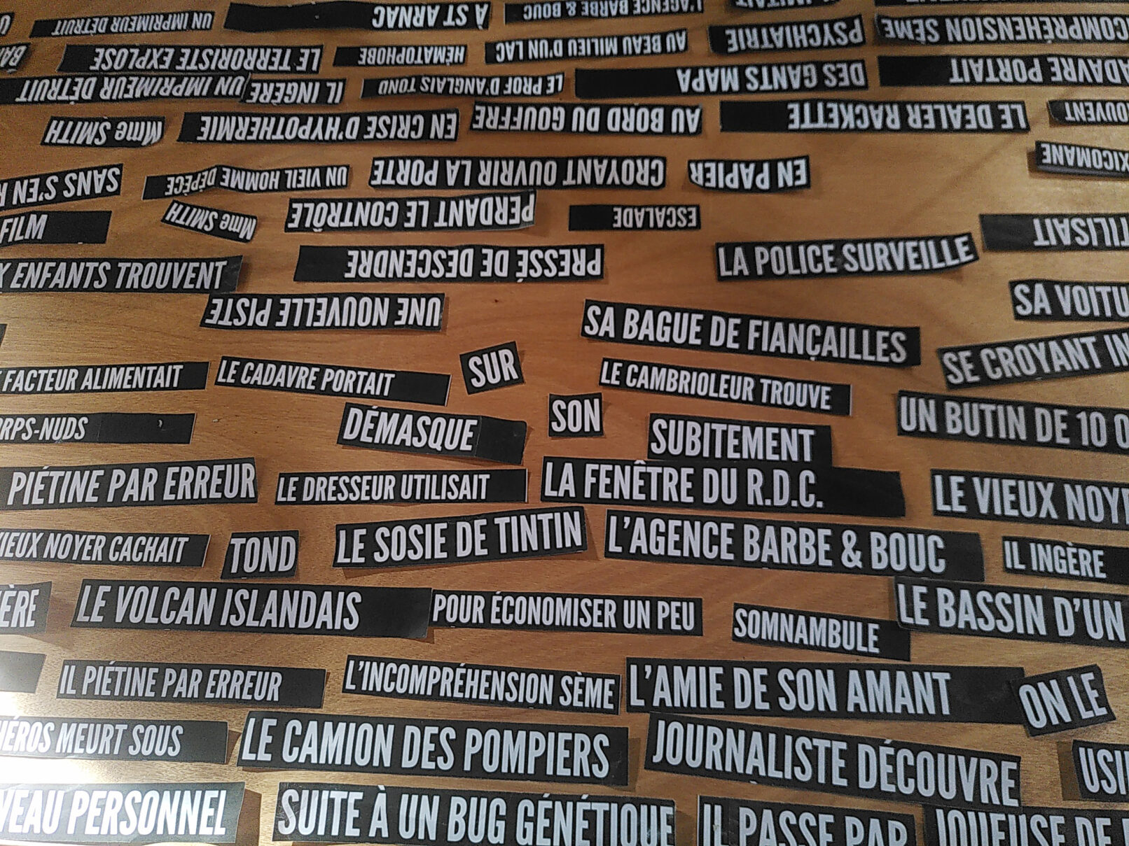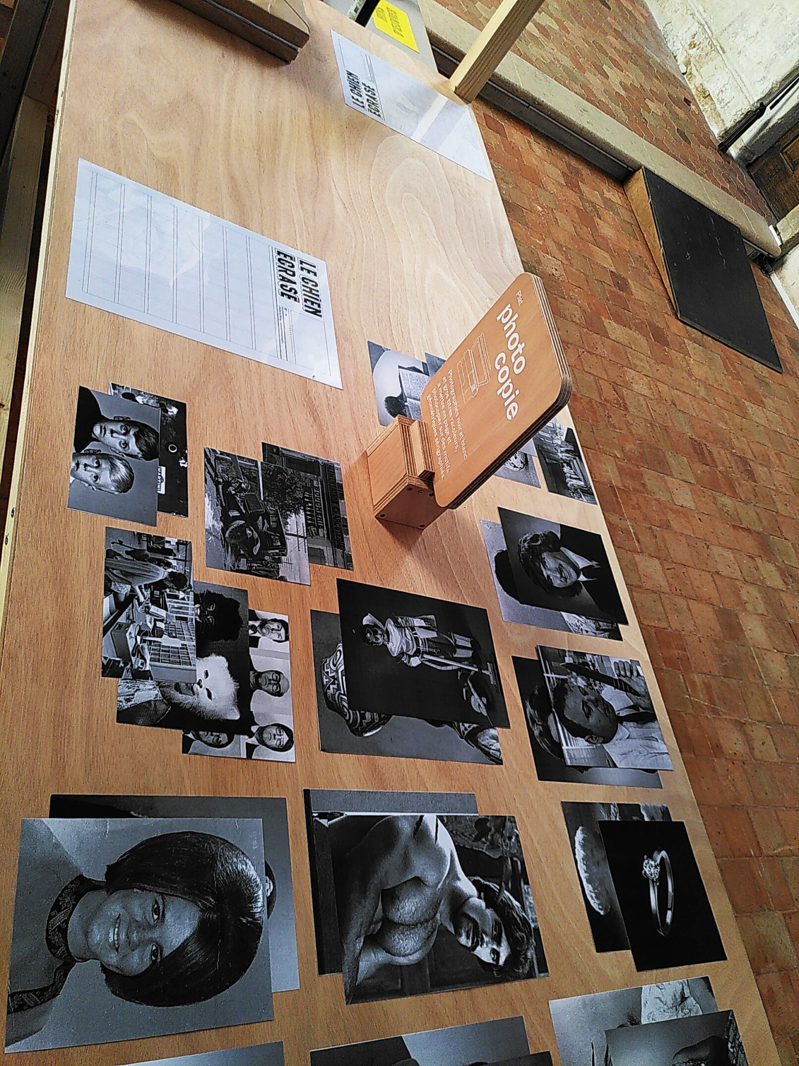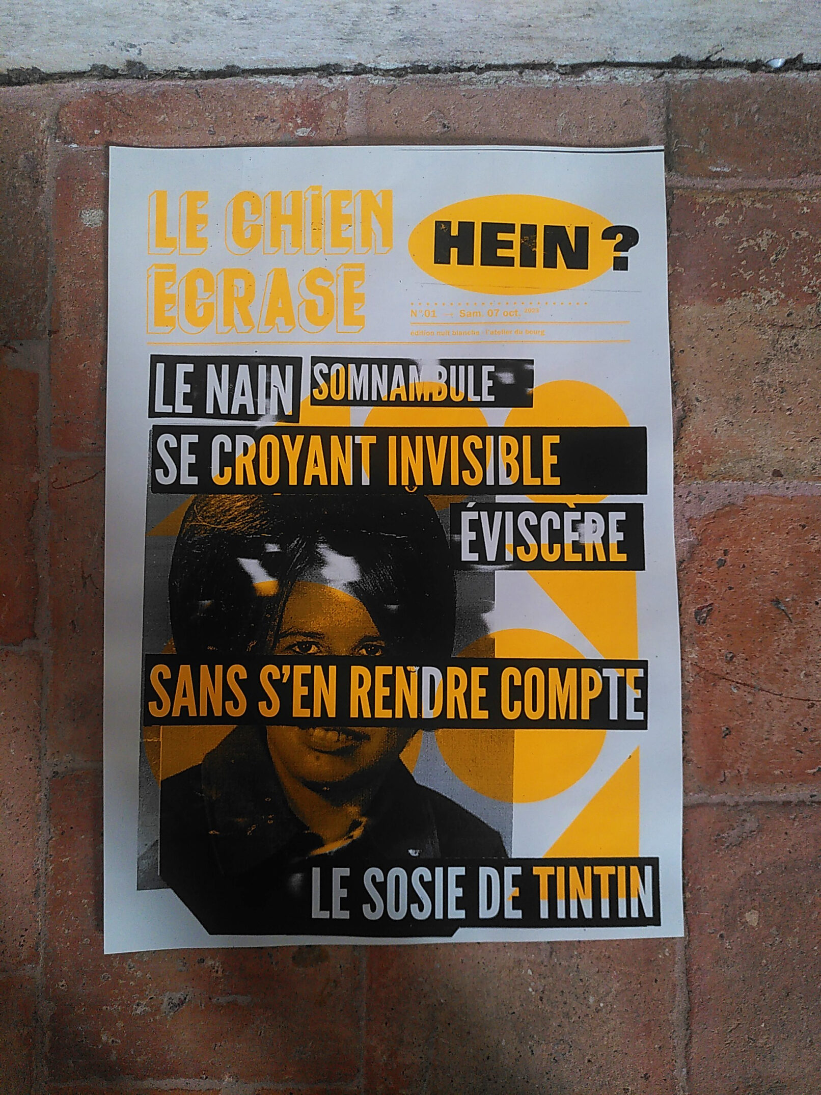 En plat principal, le Chien Écrasé. Au choix, un ensemble d’images et de textes soigneusement sélectionnés pour laisser aux convives le soin d’élaborer la « Une » de leur rêve. Le montage sera ensuite délicatement cuit au four de la photocopie sur un des 6 fonds sérigraphiés au préalable par l’équipe de l’Atelier du Bourg.