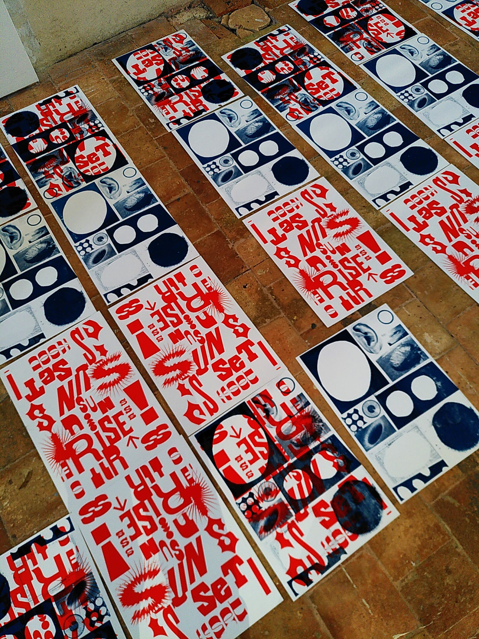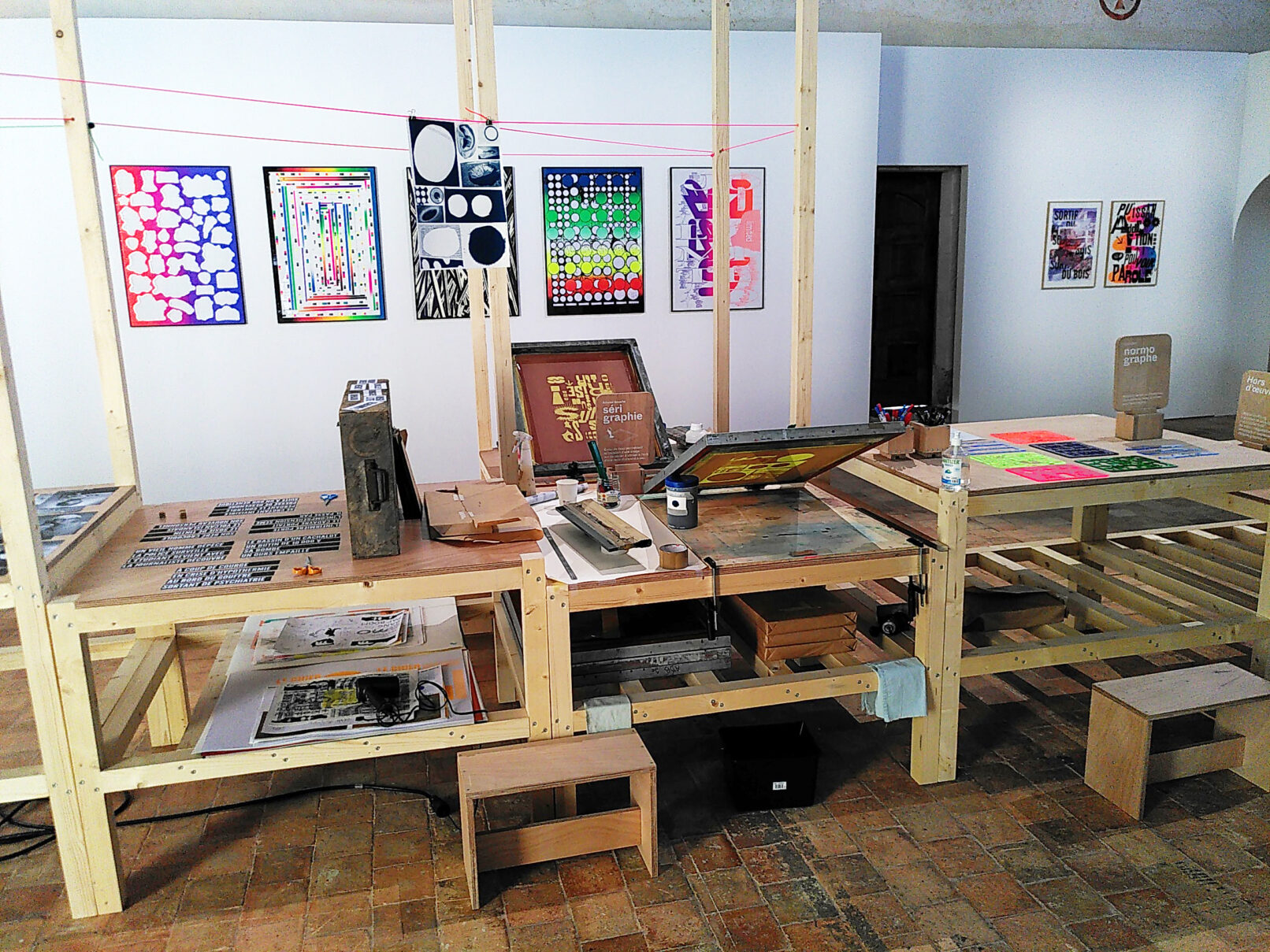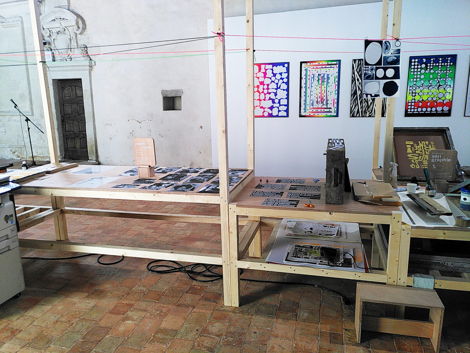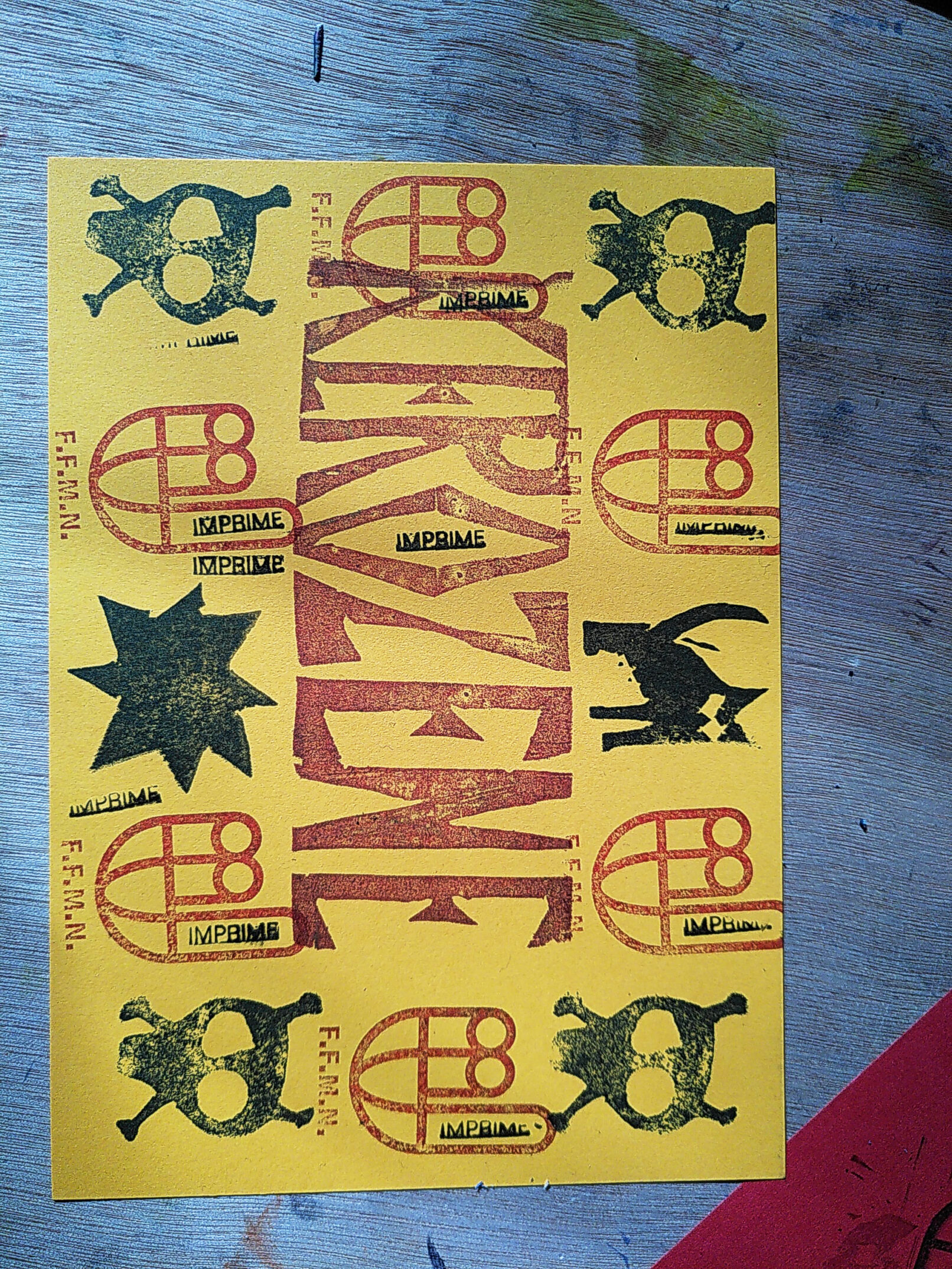 Impressions en sérigraphie 2 couleurs, en letter press, composition en photocopie, tampons, normographes.