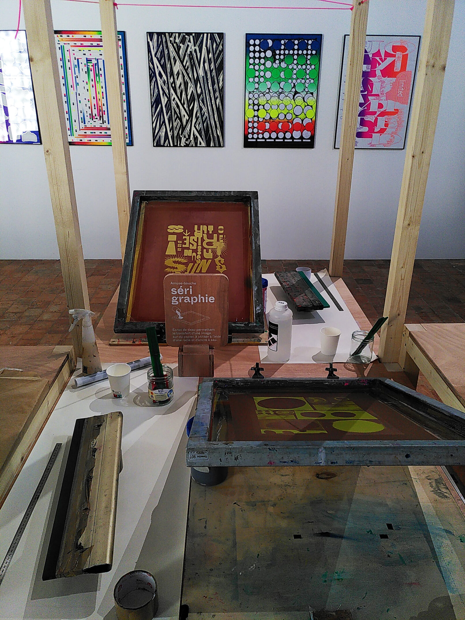 Le plat suivant est un duo de sérigraphies. Deux cadres permettent de réaliser une œuvre en bichromie et de s’initier aux joies de l’impression sur papier.