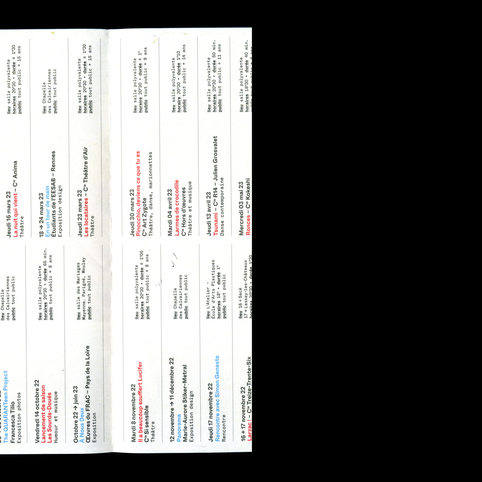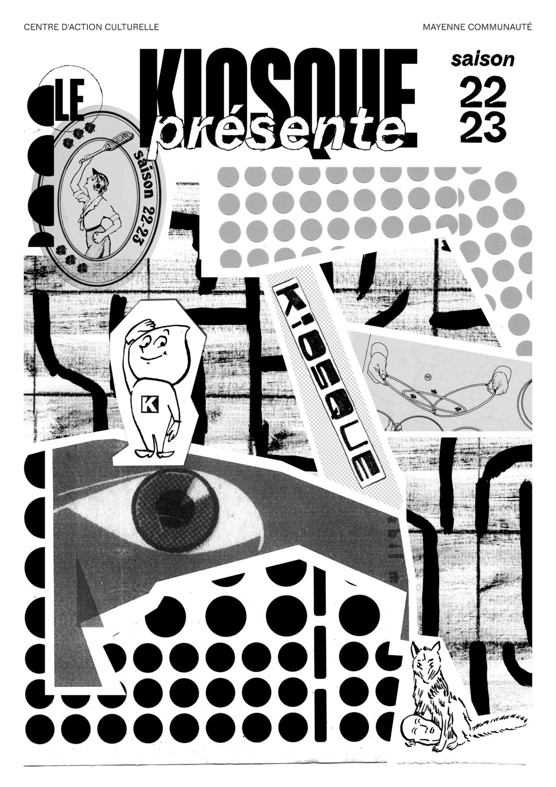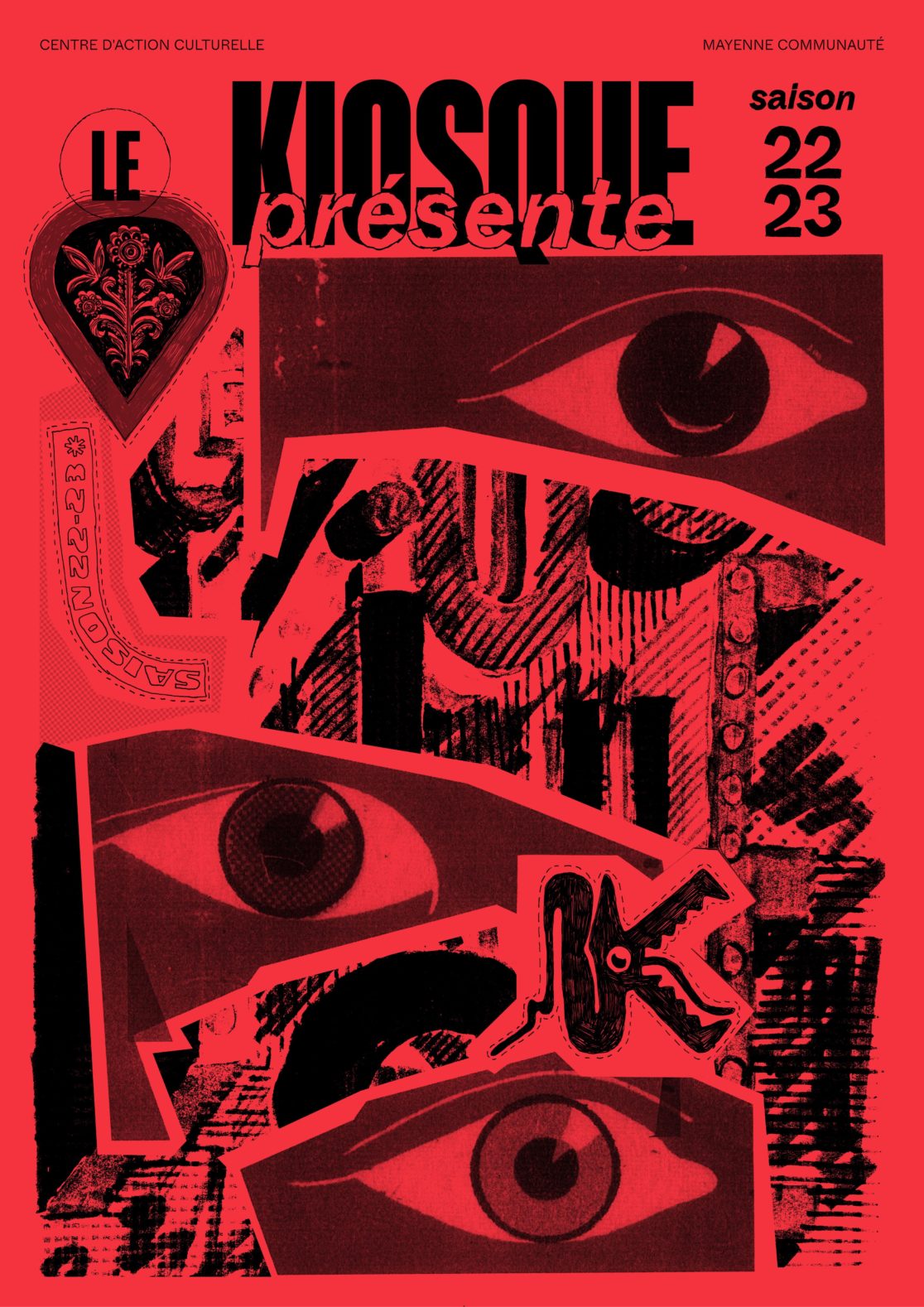La saison 22/23 se révèle tout d’abord au public par l’affiche de saison présente dans la ville de Mayenne. L’affiche s’inspire des unes qui se superposent, se dévoilent et s’entassent dans les kiosques à journaux.