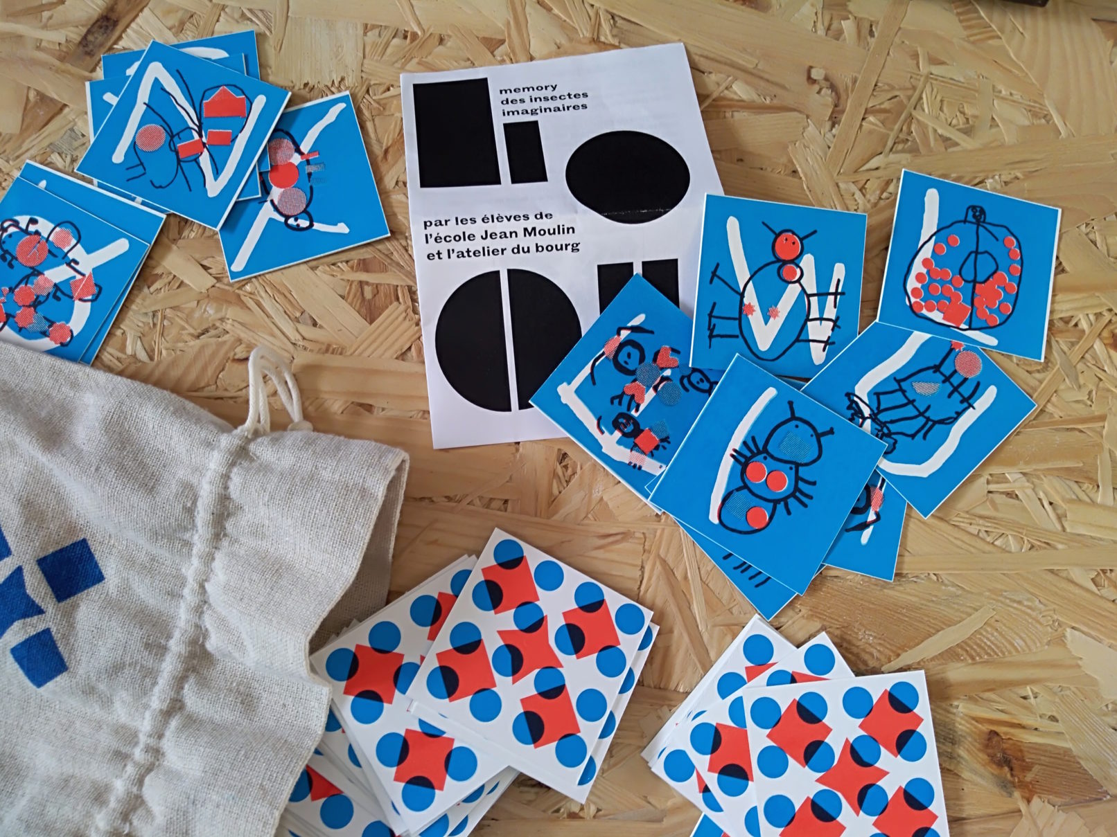 Ces deux jeu de memory des insectes imaginaires ont été conçus et réalisés par les enfants de l’école maternelle Jean Moulin (Rennes, Villejean) et les artistes de L’Atelier du Bourg. Il ont été dessinés puis imprimés en sérigraphie avec les enfants, à Rennes sur l’année scolaire 2018-2019.