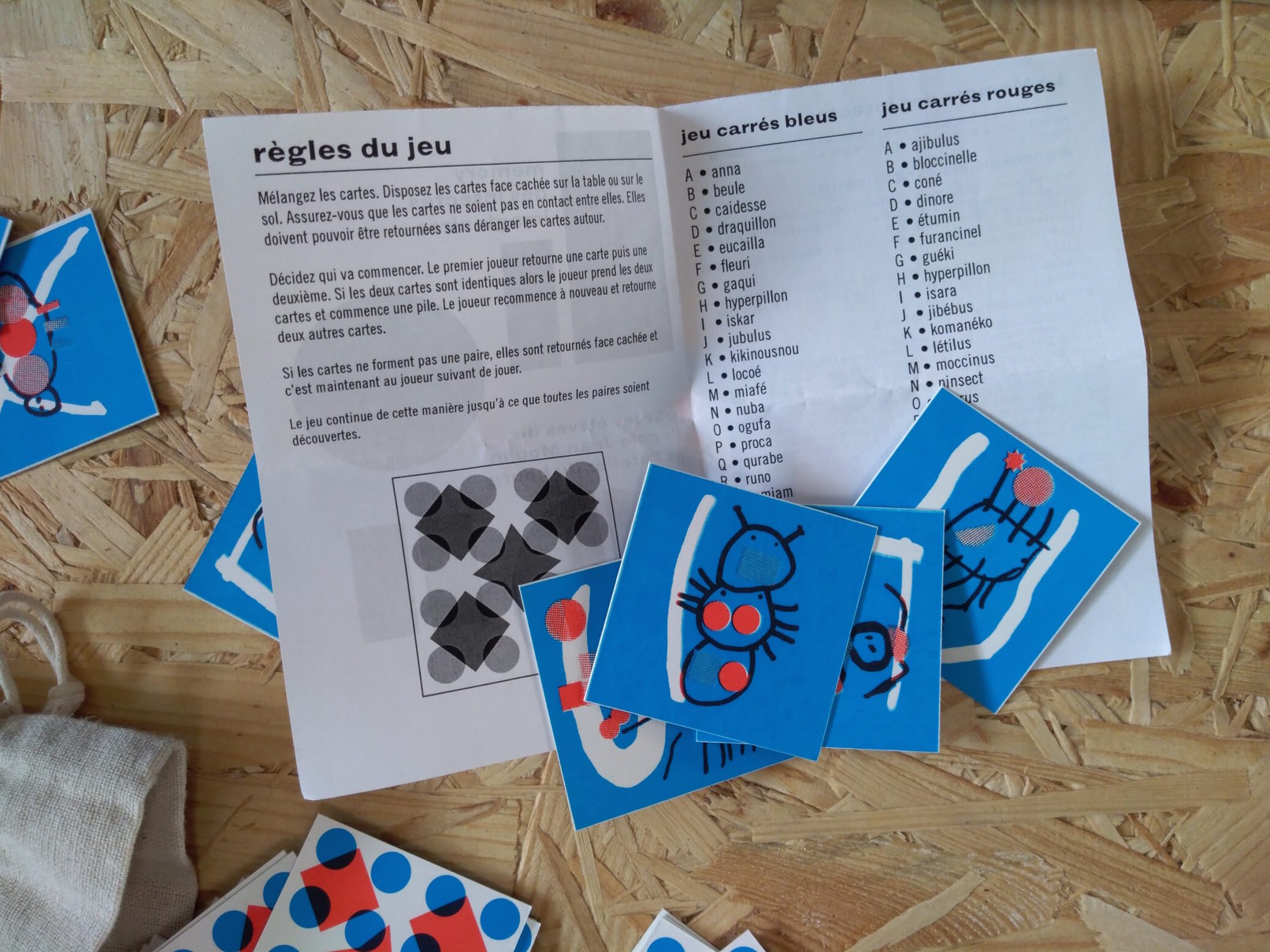 Ces deux jeux de memory – un rouge et un bleu – se veulent un laboratoire graphique autour des insectes et de l’abécédaire. Dans chacun des jeux, chaque carte et sa jumelle présentent 26 insectes imaginés par les enfants. Chacun des insectes a donc un nom commençant par l’une des 26 lettres de l’alphabet, inventé par son auteur.