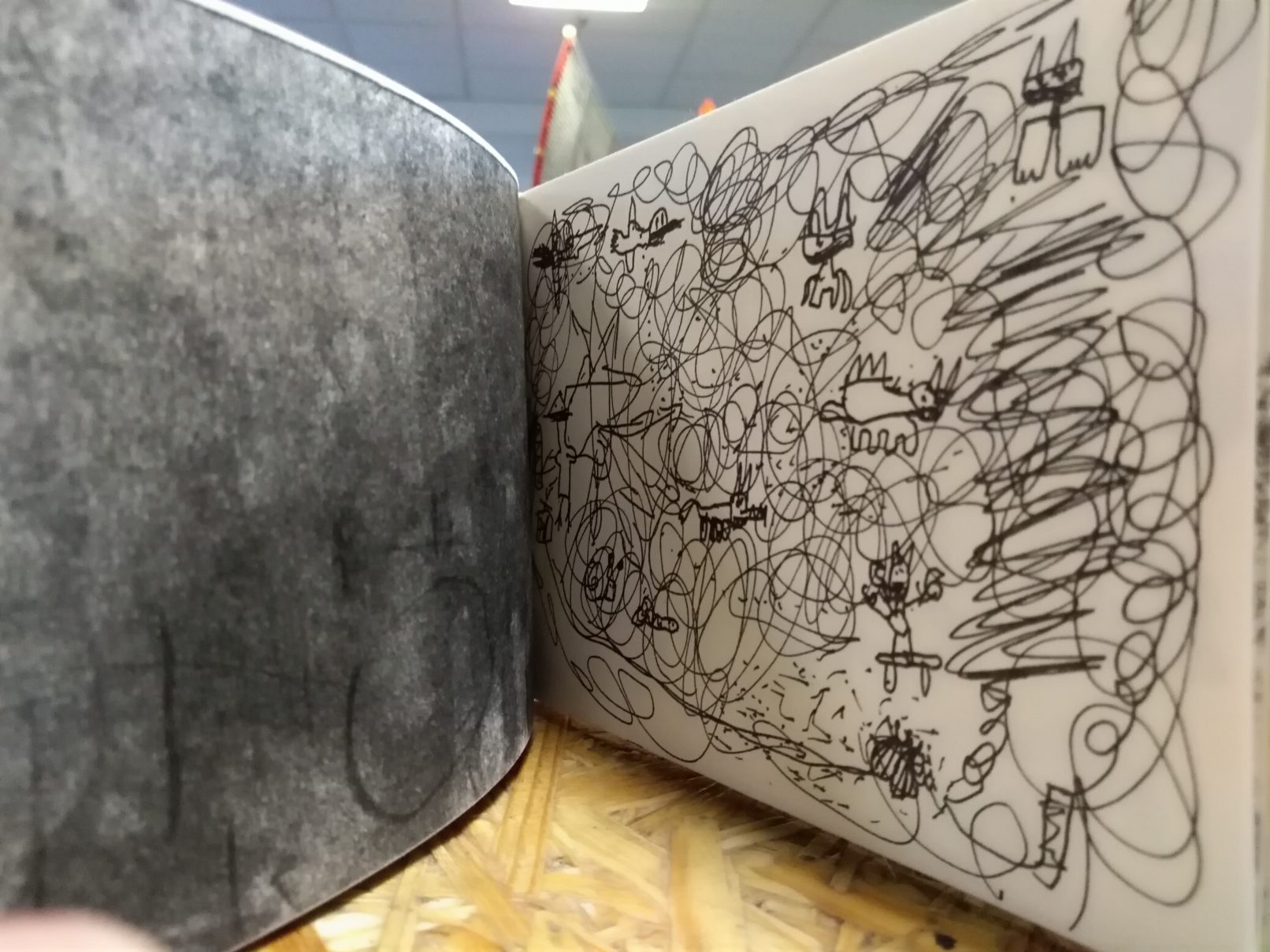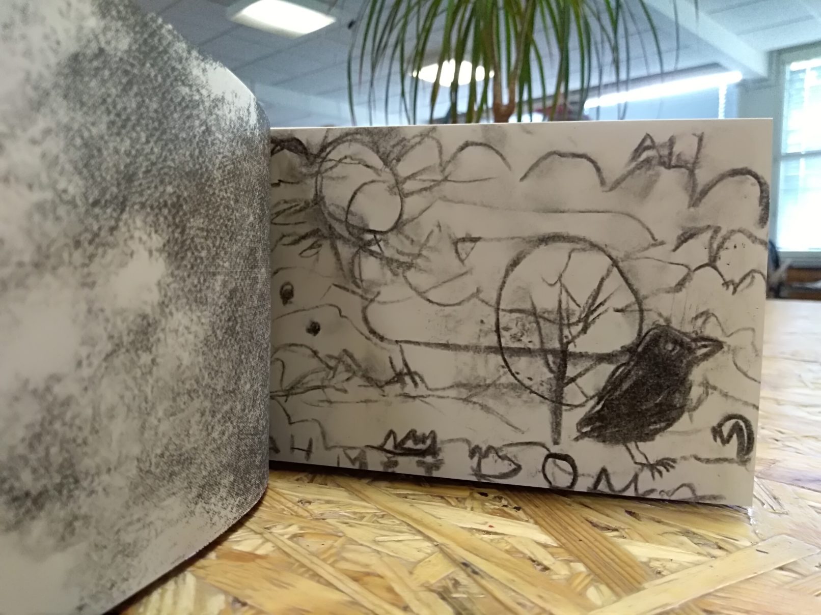 Noir comme la fourrure du renard • annuaire d’émotions est un livre réalisé par l’ensemble des élèves de l’école Jacques Prévert de Rennes. Il comprend des dessins réalisés avec des outils ne produisant que du noir ou des gris (crayon papier, mine graphite, fusain, encre de chine, feutres fins) sur du papier blanc. Seuls les poèmes à la fin sont en couleur ainsi que le fil de couture qui varie selon l’émotion évoquée. Juste pour le plaisir, voici un poème très court mais troublant pour un enfant de 10 ans : (une ligne exprimant la colère)